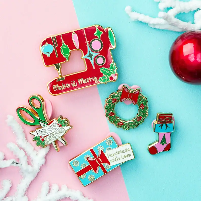 Right: Share your Christmas spirit with this adorable Holiday Sewing Machine pin set from Fleece Fun Shop
